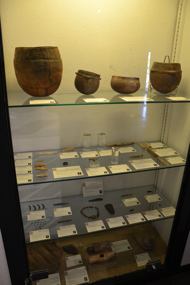 dans la salle principale la vie quotidienne et les nouvelles activités qui s’instaurent peu à peu lors de la Révolution néolithique. L’exposition Regards sur le Néolithique se termine par l’évocation du monde des morts avec une reproduction du dolmen restauré de Salles-la-Source qui a livré de précieux renseignements aux chercheurs grâce notamment à une partie de son parement encore intact.